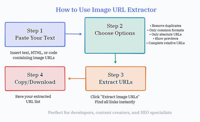 Quickly extract all image URLs from any text or code with our easy-to-use tool. Perfect for developers, content creators, and SEO specialists.