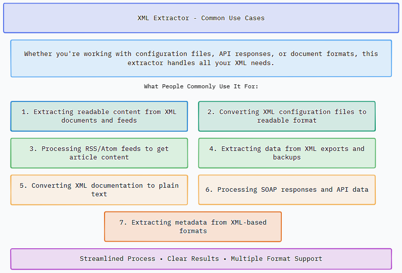 Whether you're working with configuration files, API responses, or document formats, this extractor handles all your XML needs. Here's what people commonly use it for: