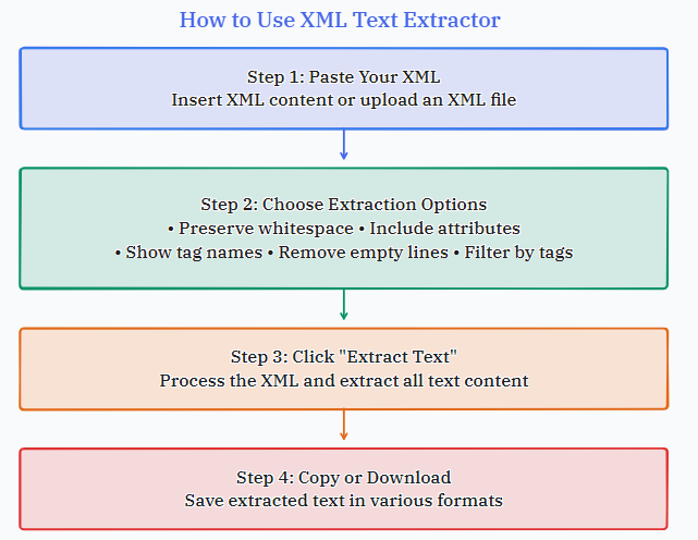 Preserve whitespace: Keep original formatting and spacingInclude attributes: Extract text from XML attributes tooShow tag names: Include XML tag names with extracted textRemove empty lines: Clean up the output by removing blank linesFilter by tags: Only extract text from specific XML tags