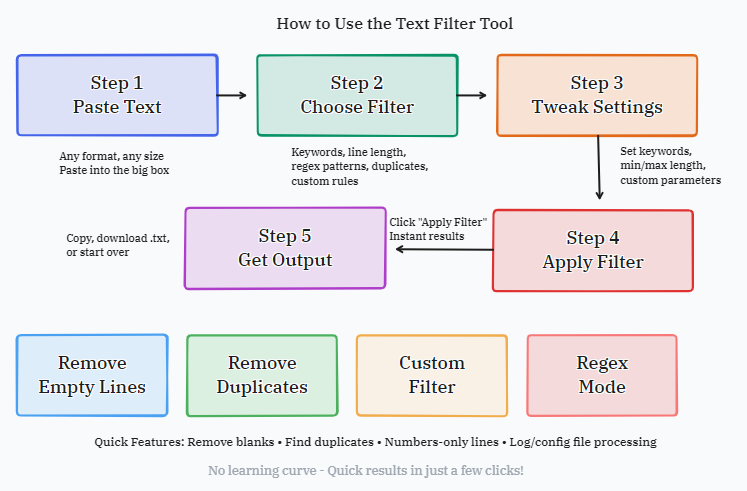 A text filter tool lets you quickly scan through chunks of text and pull out exactly what you want—without the hassle of doing it by hand. Think of it like a smart sieve for words: you set the rules, and it does the sorting.