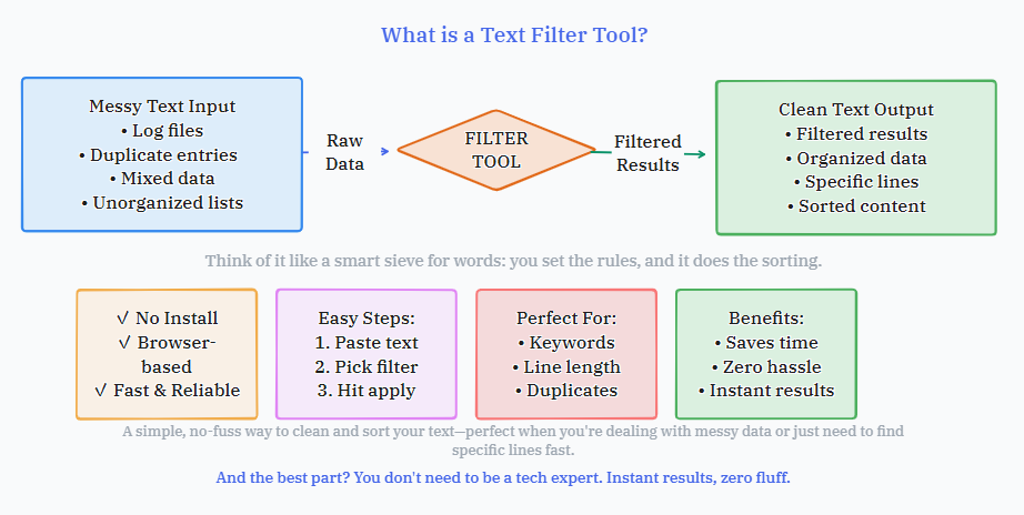 And the best part? You don’t need to be a tech expert. Just paste your text, pick a filter (like keywords or line length), and hit apply. Instant results, zero fluff.
