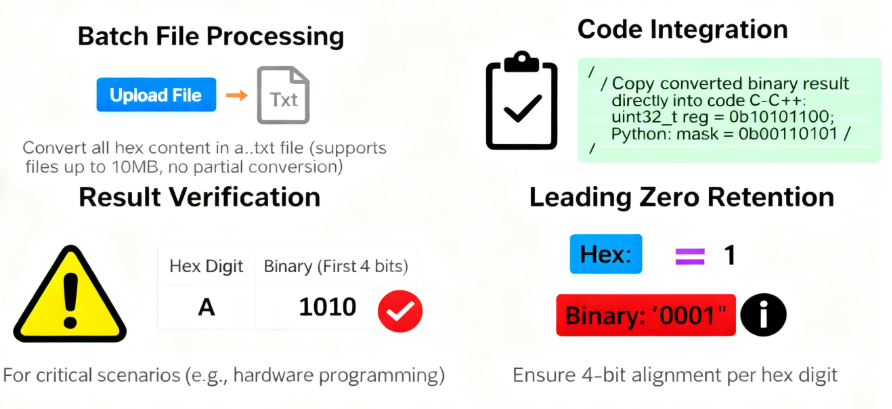 Here’s the quick lowdown on hex to binary conversion: it’s just swapping hex numbers (you know, the ones with 0-9 and A-F) for binary’s 0s and 1s, and the best part—each single hex digit lines up with exactly four binary bits, so it’s super straightforward (like F becomes 1111, no messy math needed!).