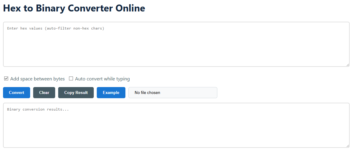Spaces improve readability for most use cases (e.g., hardware registers, file headers) where data is processed in byte-sized units. Uncheck "Add space between bytes" for continuous binary (e.g., for bitstream files).