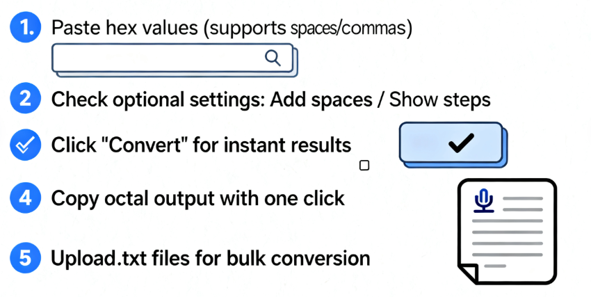 Using this tool is super simple—no fancy tech skills required. Whether you’re pasting a quick hex string or uploading a whole file, these steps will get you your octal result fast.