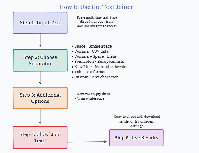 A text joiner is a utility that takes multiple lines of text and combines them into a single continuous string. Unlike basic text editors that require manual line merging, this tool automates the process while giving you control over how the lines are connected.