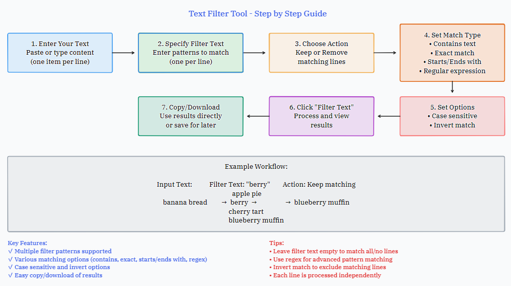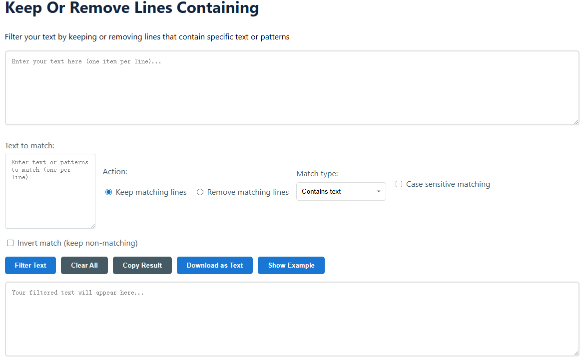 Contains text: Line contains the specified text anywhereExact match: Line matches exactly (including whitespace)Starts with: Line begins with the specified textEnds with: Line ends with the specified textRegular expression: Advanced pattern matchingCase sensitive: Match exact letter casingInvert match: Keep lines that don't match your criteria1. You enter:apple pie