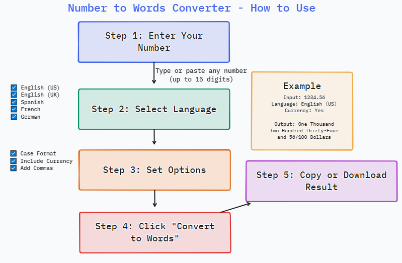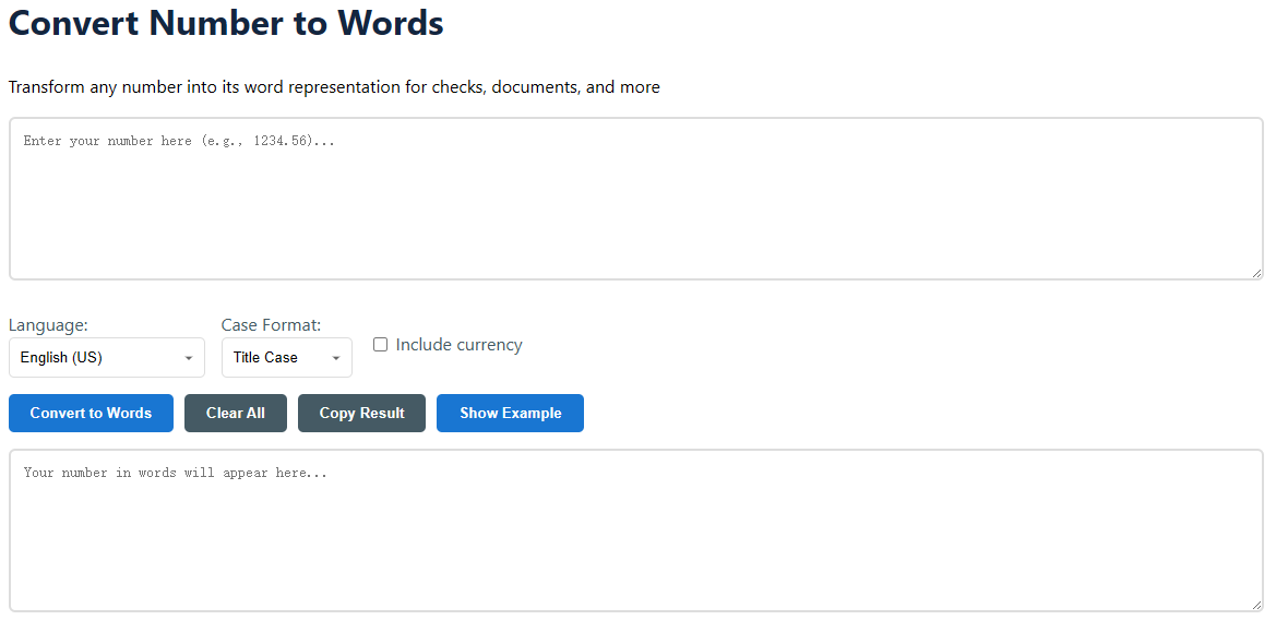 English (US) - American English formatEnglish (UK) - British English formatSpanish - Spanish number formatFrench - French number formatGerman - German number formatCase Format: Choose how words are capitalizedInclude currency: Add currency format (dollars and cents)Add commas: Include commas for better readability1. You enter: 1234.56