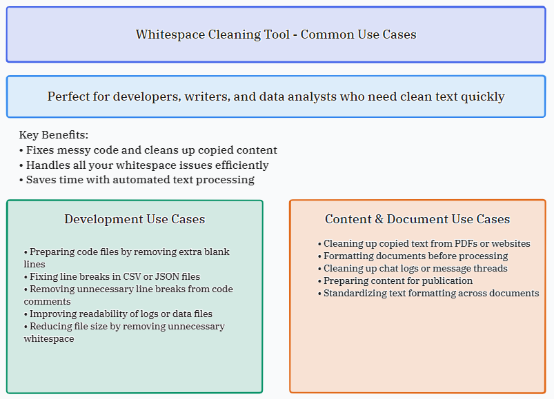 From fixing messy code to cleaning up copied content, this tool handles all your whitespace issues. Perfect for developers, writers, and data analysts who need clean text quickly.