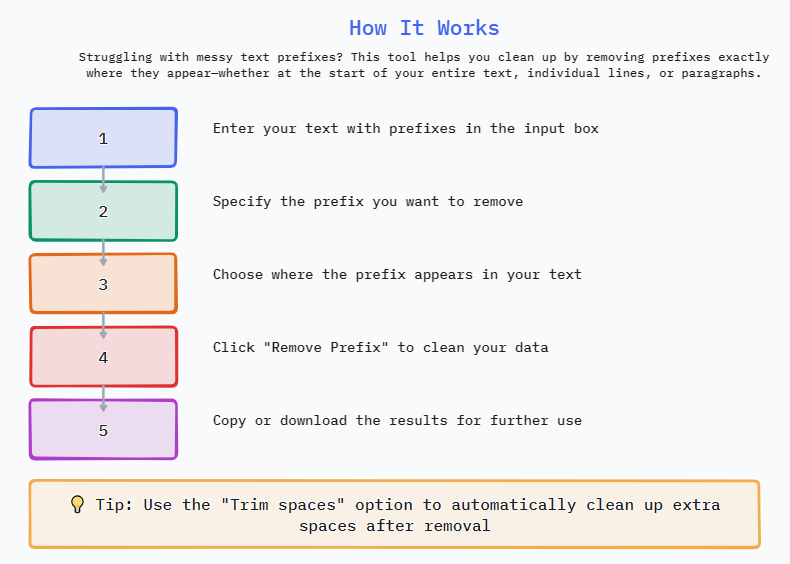 Struggling with messy text prefixes? This tool helps you clean up by removing prefixes exactly where they appear—whether at the start of your entire text, individual lines, or paragraphs. Just specify your prefix and location, and let the tool handle the rest!