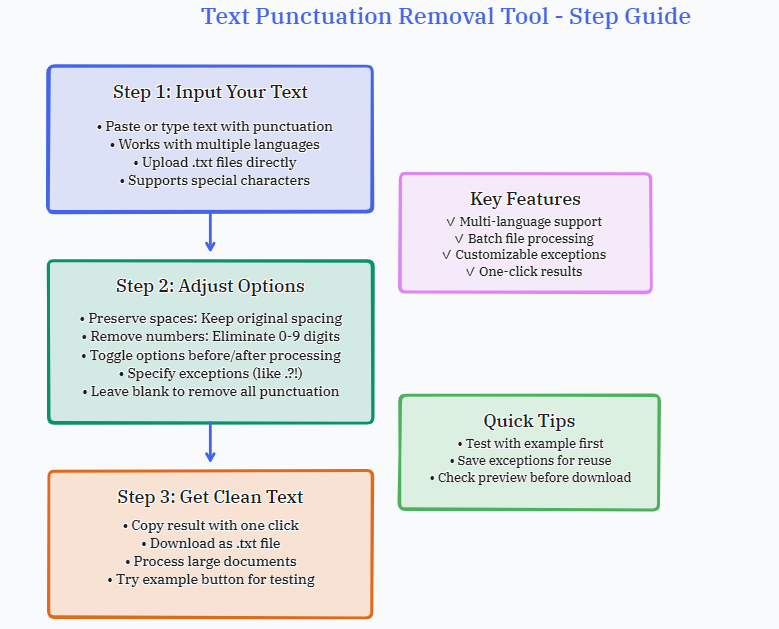 Got text full of punctuation you want to clean up? This tool makes it easy to remove all those pesky symbols while keeping what matters. Just follow these simple steps to get your text ready in seconds!
