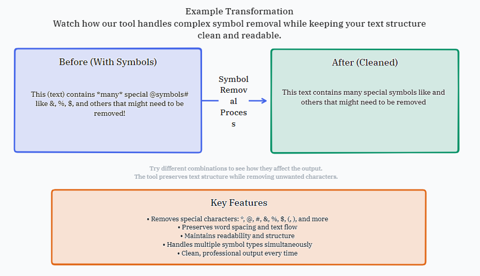 Watch how our tool handles complex symbol removal while keeping your text structure clean and readable. Try different combinations to see how they affect the output.