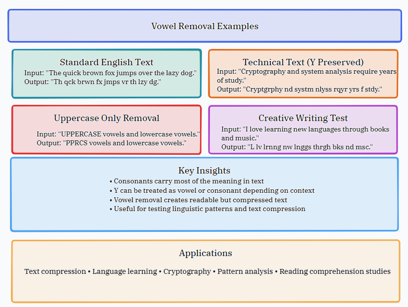 Removing vowels isn't just for puzzles - it reveals how consonants carry meaning in language. Try it with your favorite text and you'll notice how much information remains intact!