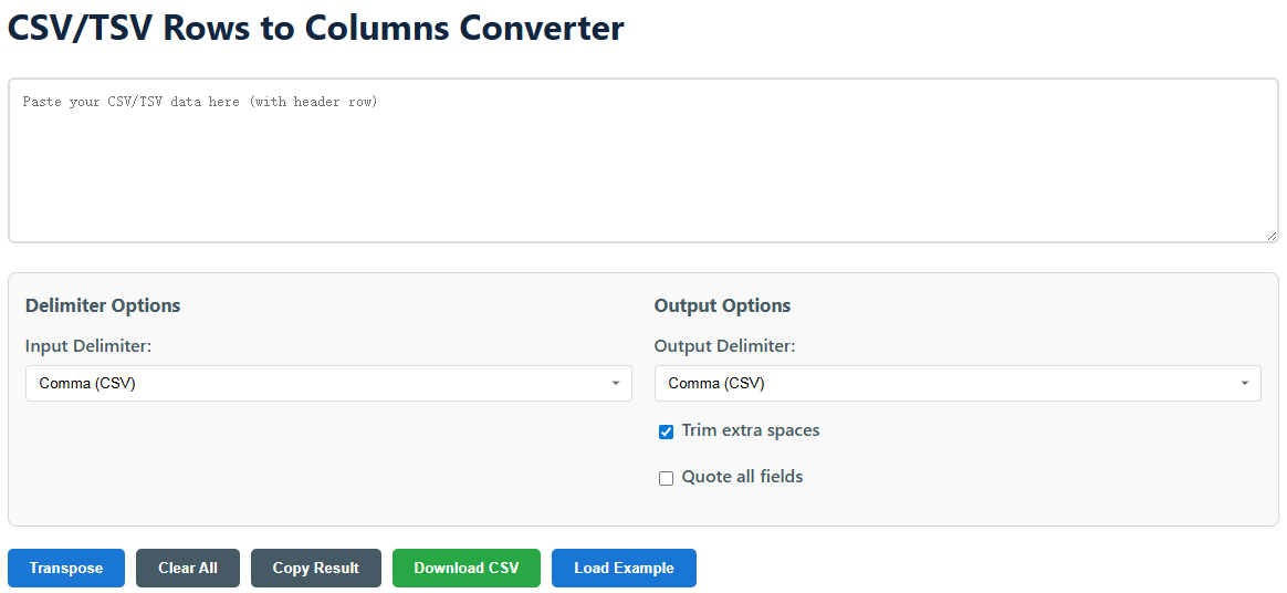 Our converter transforms your data structure by flipping rows and columns, making it easier to work with datasets that need a different orientation for analysis or presentation.