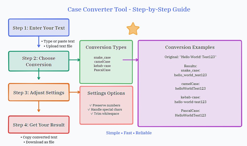 Our versatile case converter makes it easy to transform text between different naming conventions with just a few clicks. Whether you're a developer, content creator, or data professional, this tool simplifies the process of standardizing text formats.