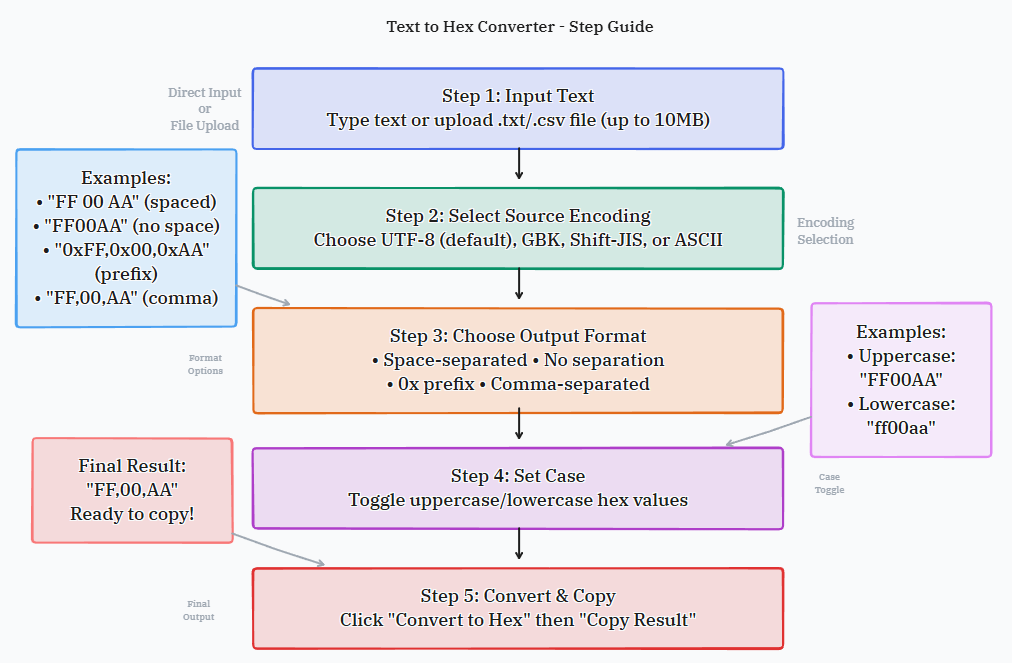 Using this converter is simple—follow these steps to turn your text into hex, no technical skills required. Whether you’re working with a quick phrase or a big file, it only takes a minute.