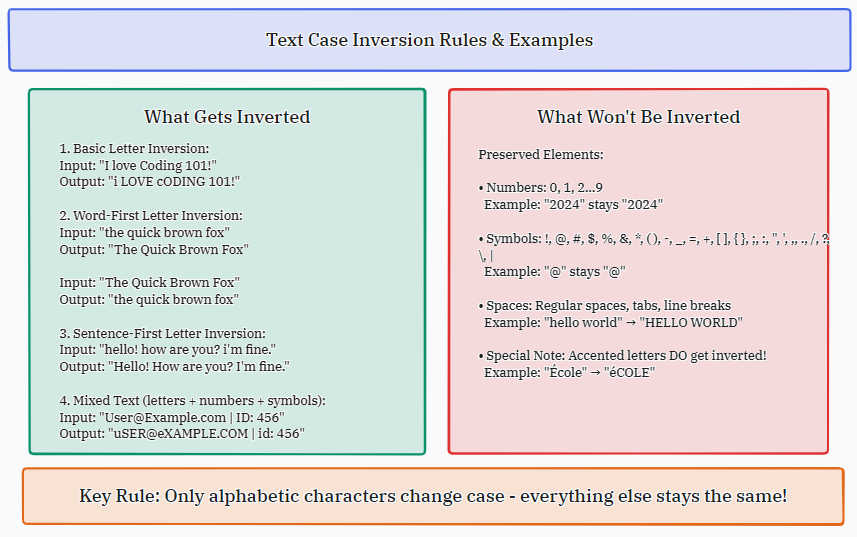 Changing numbers or symbols would break links (e.g., "https://Example.com" → "HTTPS://eXAMPLE.COM" is bad), IDs (e.g., "ID: 123" → "id: 123" is good, but "id: 123" → "id: 123" stays the same), and formatting. We keep them intact so your text works as intended!