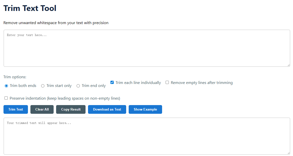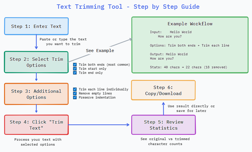 Trim both ends: Remove spaces from start and end (most common)Trim start only: Remove spaces only from the beginningTrim end only: Remove spaces only from the endTrim each line individually: Process each line separatelyRemove empty lines: Delete lines that become empty after trimmingPreserve indentation: Keep leading spaces on non-empty lines1. You enter: Hello World \n How are you?